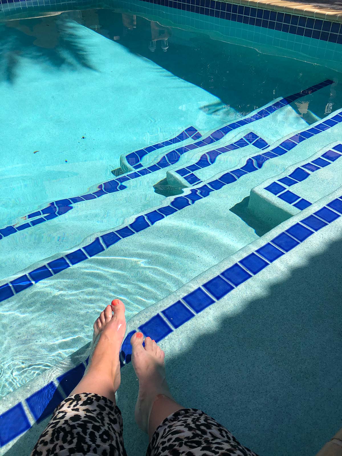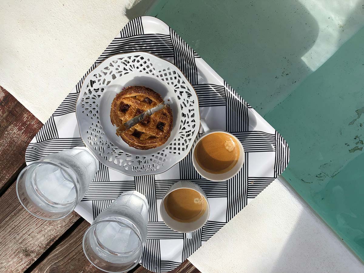 Koffie en appeltaart aan de rand van het zwembad.