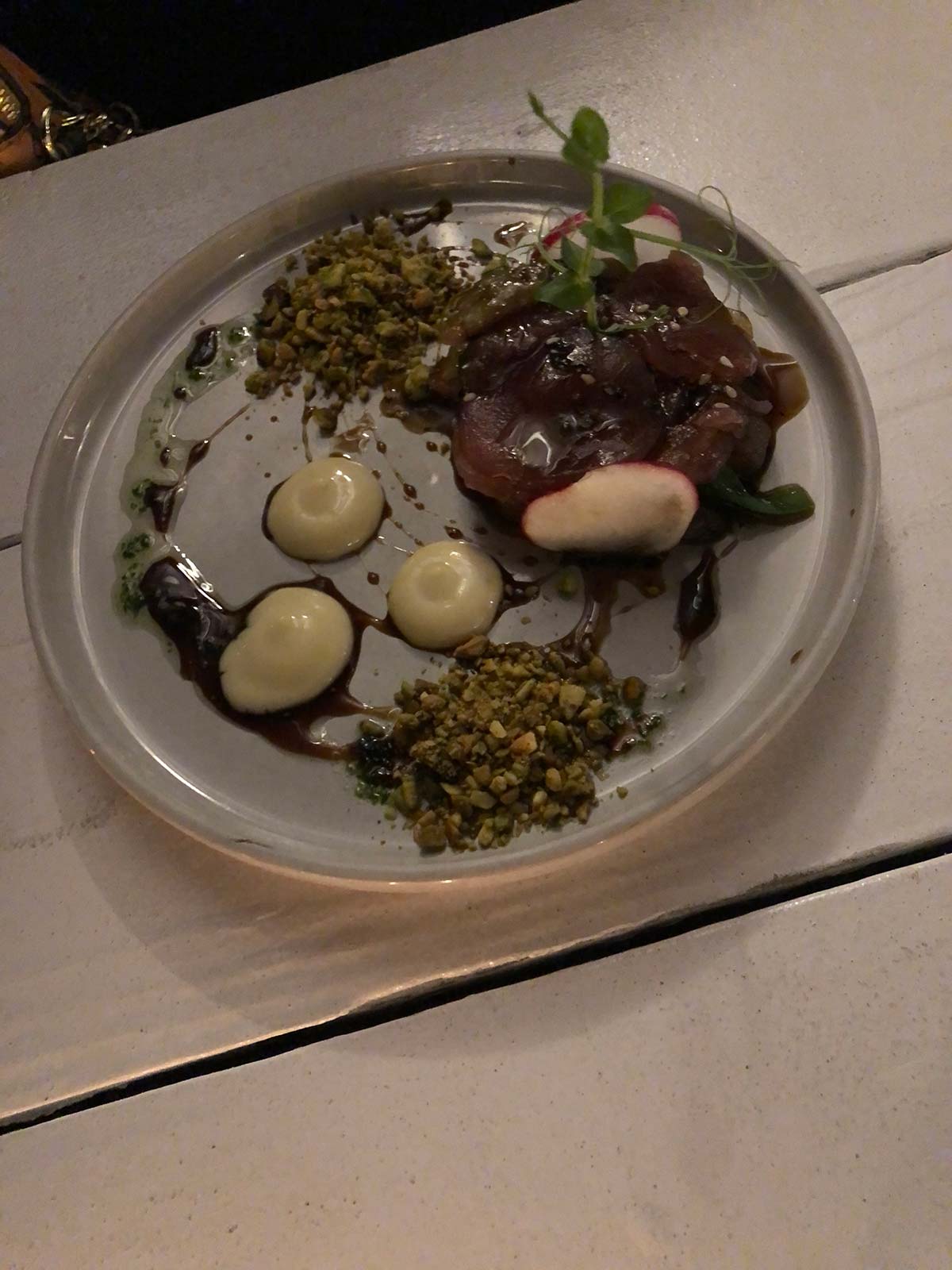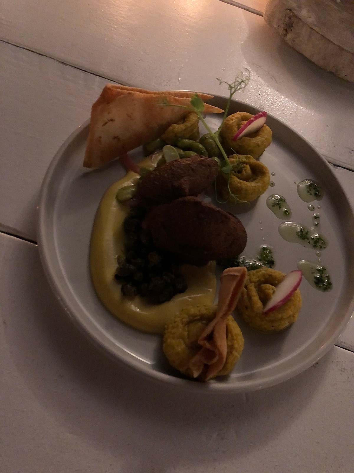 Een hele artistieke foto van mijn hoofdgerecht: gerookte biet met heel veel verschillende soorten groenten.