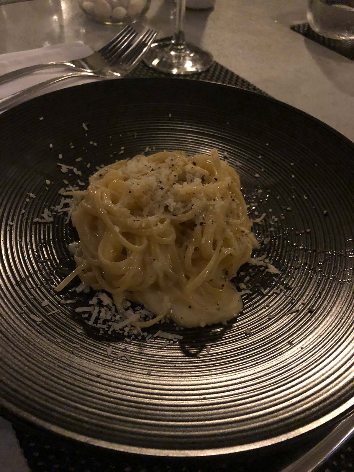 Annemieke en ik delen twee voorgerechten: de perfecte cacio e Pepe…