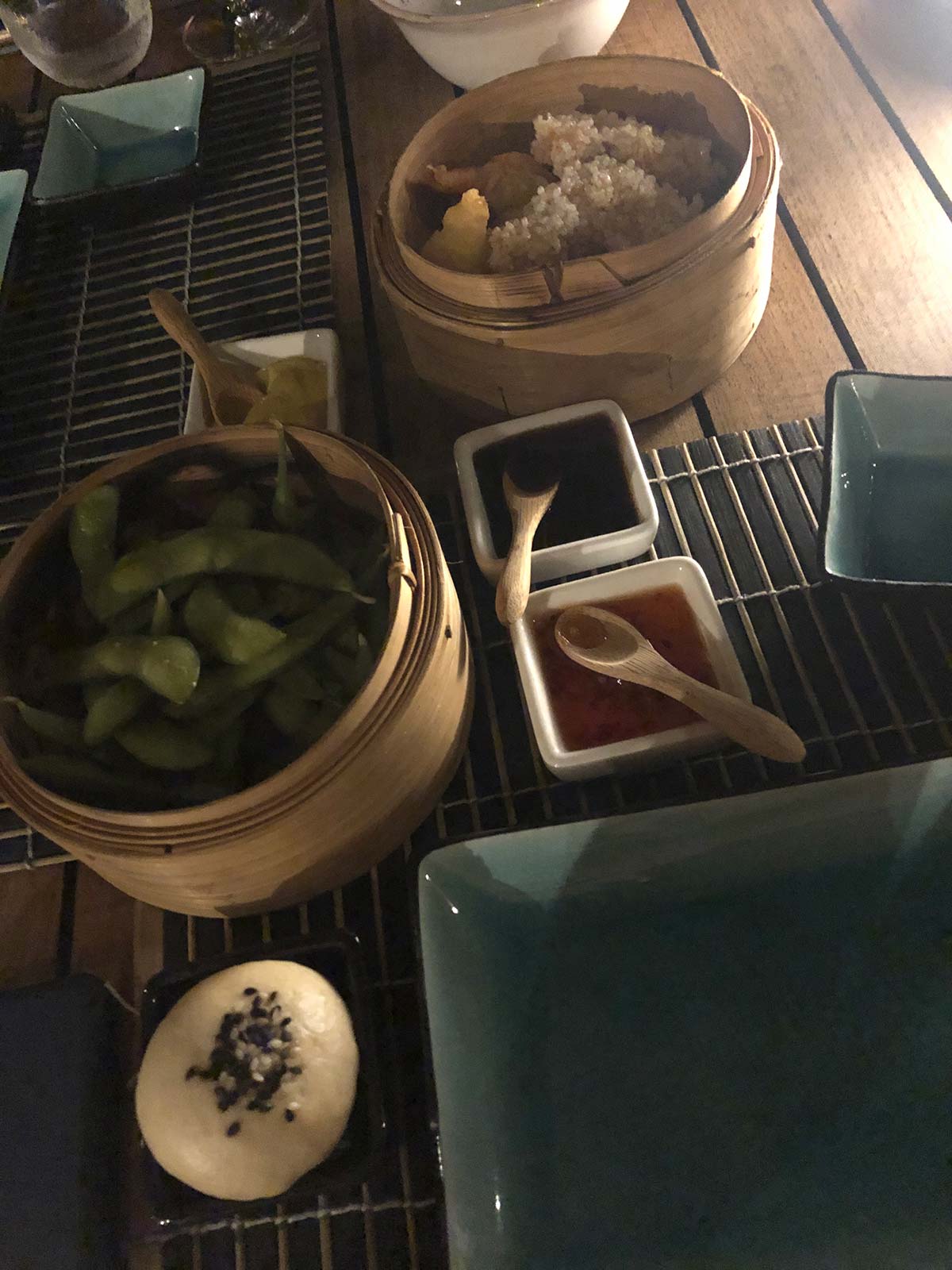 Garnalen dim sum, een bao en edamame vooraf.