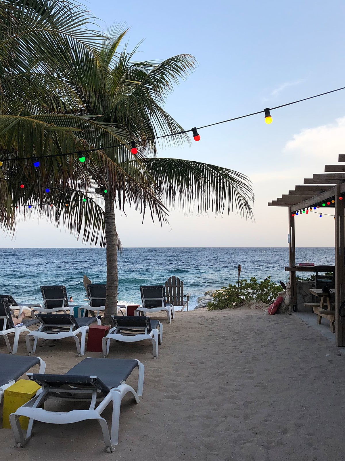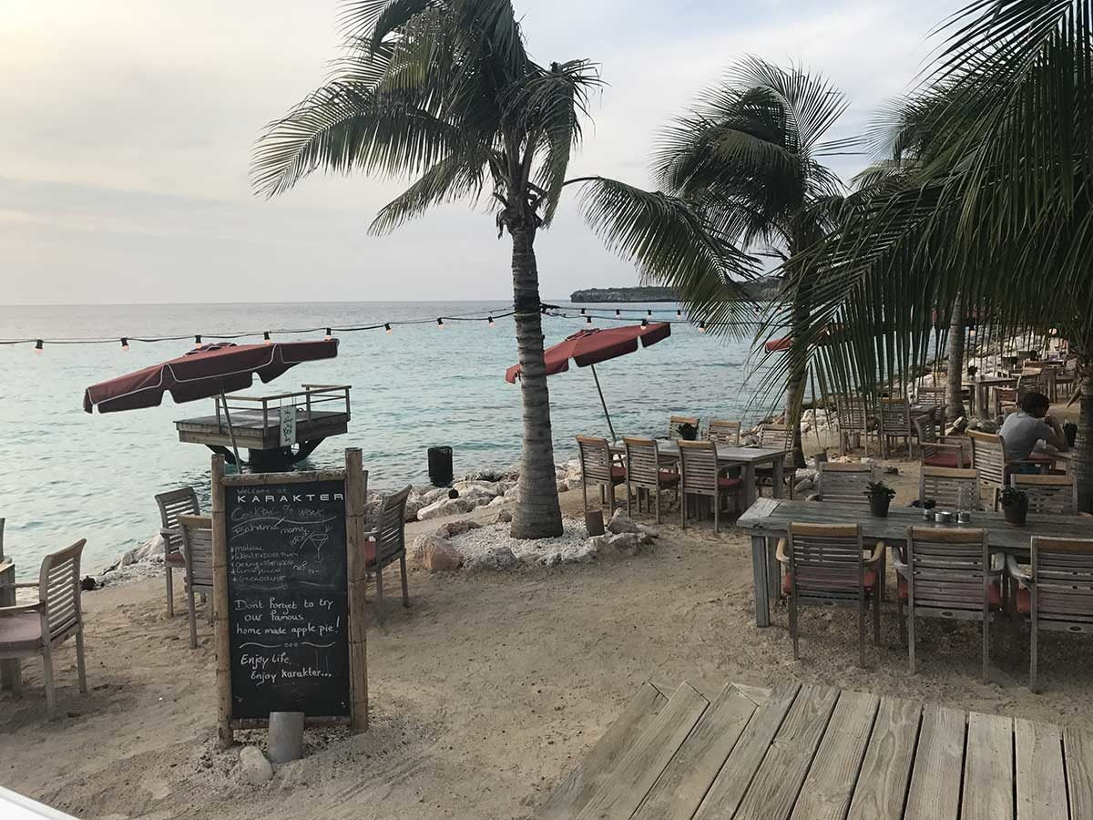 Een van mijn favoriete plekken om op het strand te chillen en lekker te eten is absoluut Karakter. Op Sint Maarten was het mijn favoriete strand, op Curacao komt ‘ie aardig in de buurt. Karakter is een strandtent waar je de hele dag terecht kan en waar ze heerlijke relaxte bedjes hebben. Je kan er goed lunchen, dineren, koffie drinken, borrelen, het uitzicht op zee verveelt nooit en het personeel is altijd vrolijk. Hier begin ik het liefst om negen uur ’s ochtends met een koffie en dan ga ik niet weg tot ik een diner achter de kiezen heb. Tip: ga in het weekend vroeg, zodat je zeker weet dat je een ligbedje hebt.