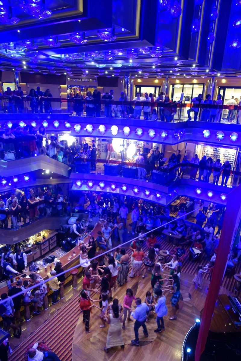 Eenmaal gesetteld gaan we een drankje drinken bij de bar in het Atrium. We zijn helemaal overwhelmed door hoe groot alles is, en door alle lichtjes, glitters, spiegels… We hebben nog geen idee wat er verder allemaal op het schip is, dus het is nog een groot mysterie, haha.