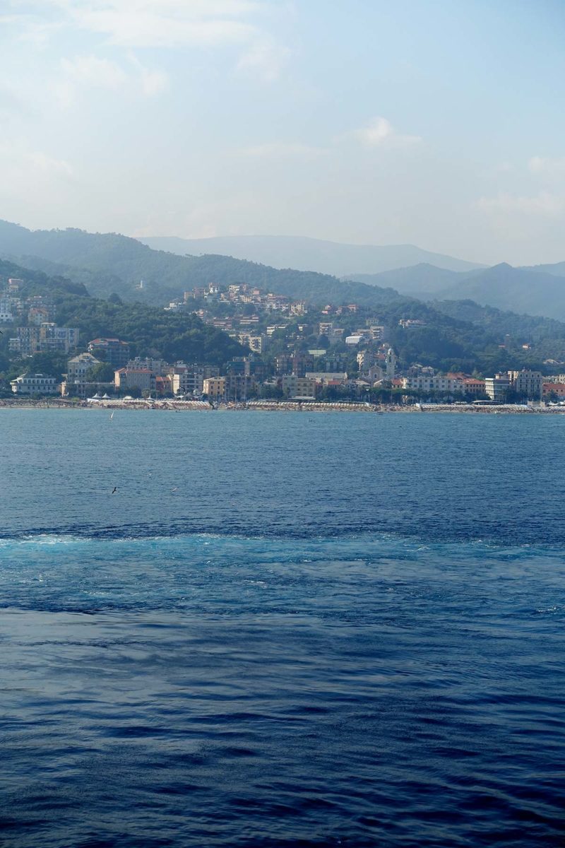 Daar gaan we weer! Rond vijven varen we weg uit Savona. Vanaf ons balkon kunnen we mooi zien hoe we steeds verder van de kust verwijderd raken.