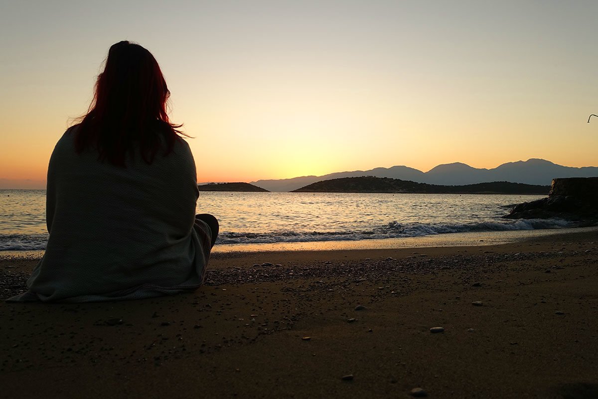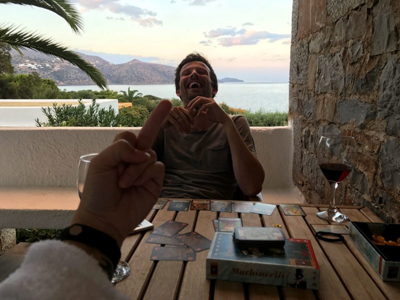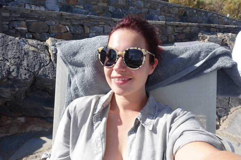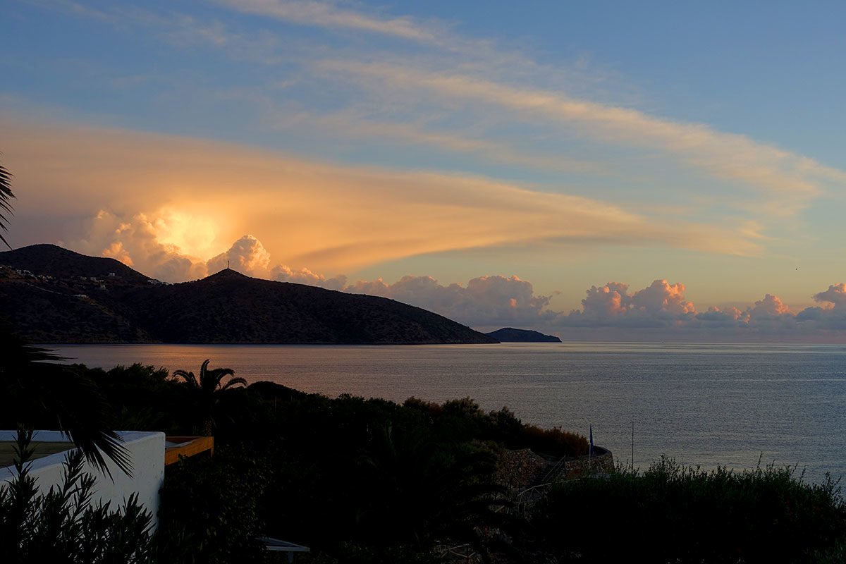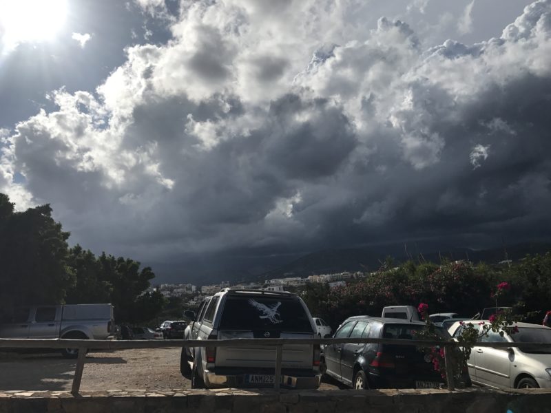 De dag begint méga bewolkt, zie die wolken over de rest van Kreta… Dat voorspelt niet veel goeds! Dat betekent: LEZEN IN BED. Heel naar.