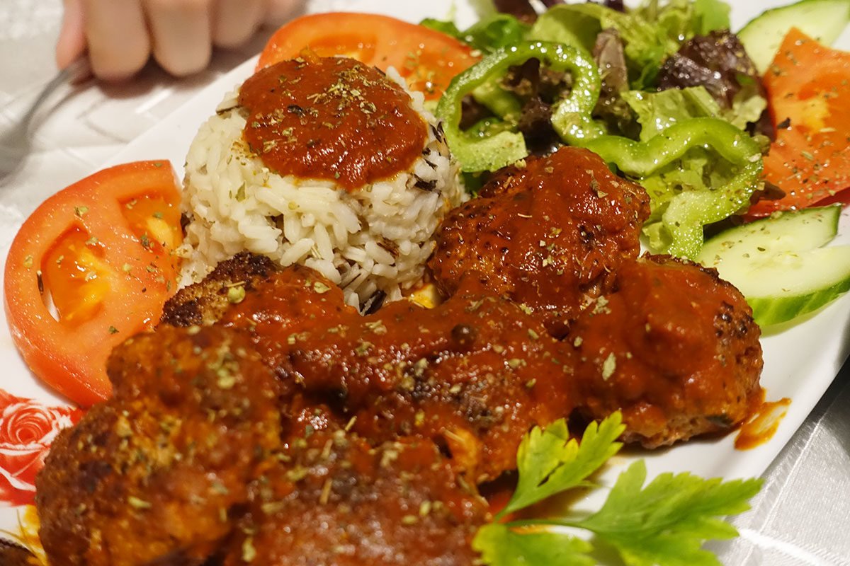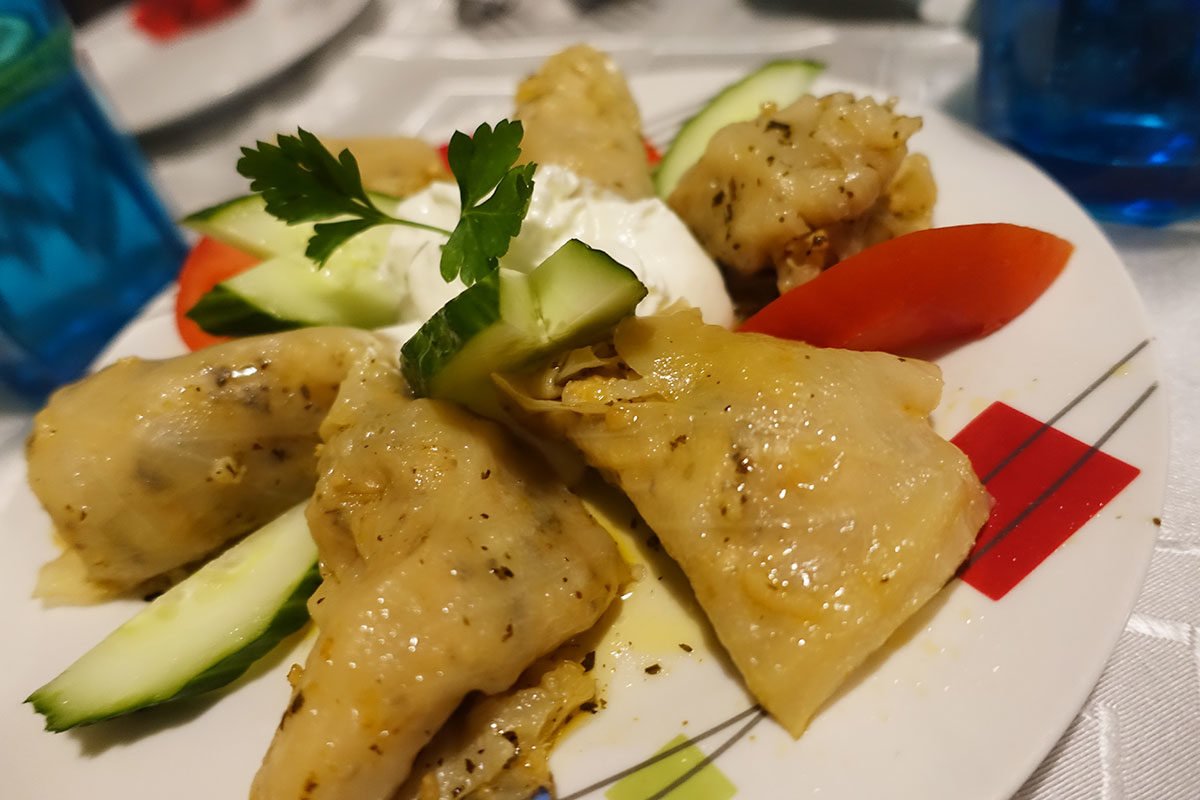 We beginnen met dolmas, normaal gesproken zijn dit gevulde wijnbladeren maar deze zijn gemaakt met kool. In de koolbladeren zit een rijstvulling met kruiden. De dolmas zijn gestoomd of gekookt en worden daarna gebakken.