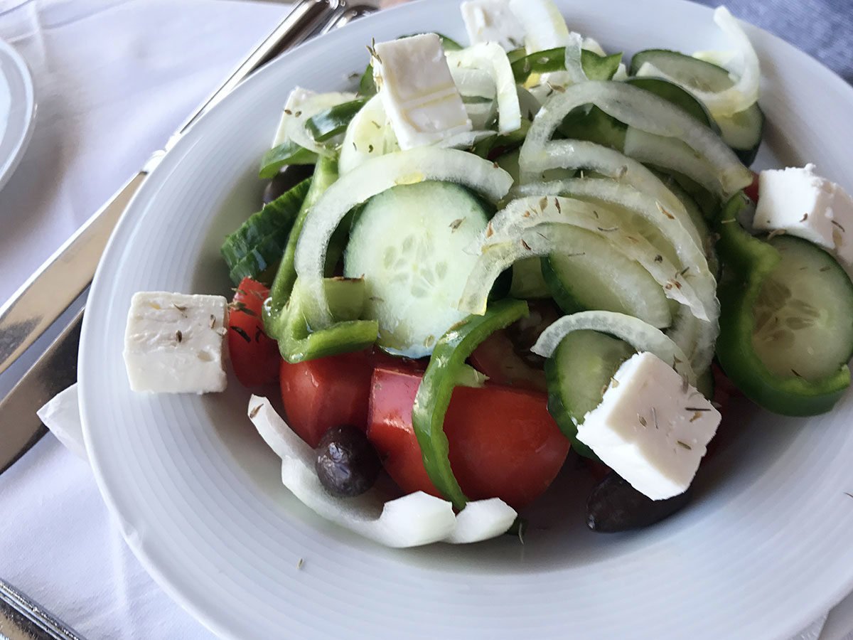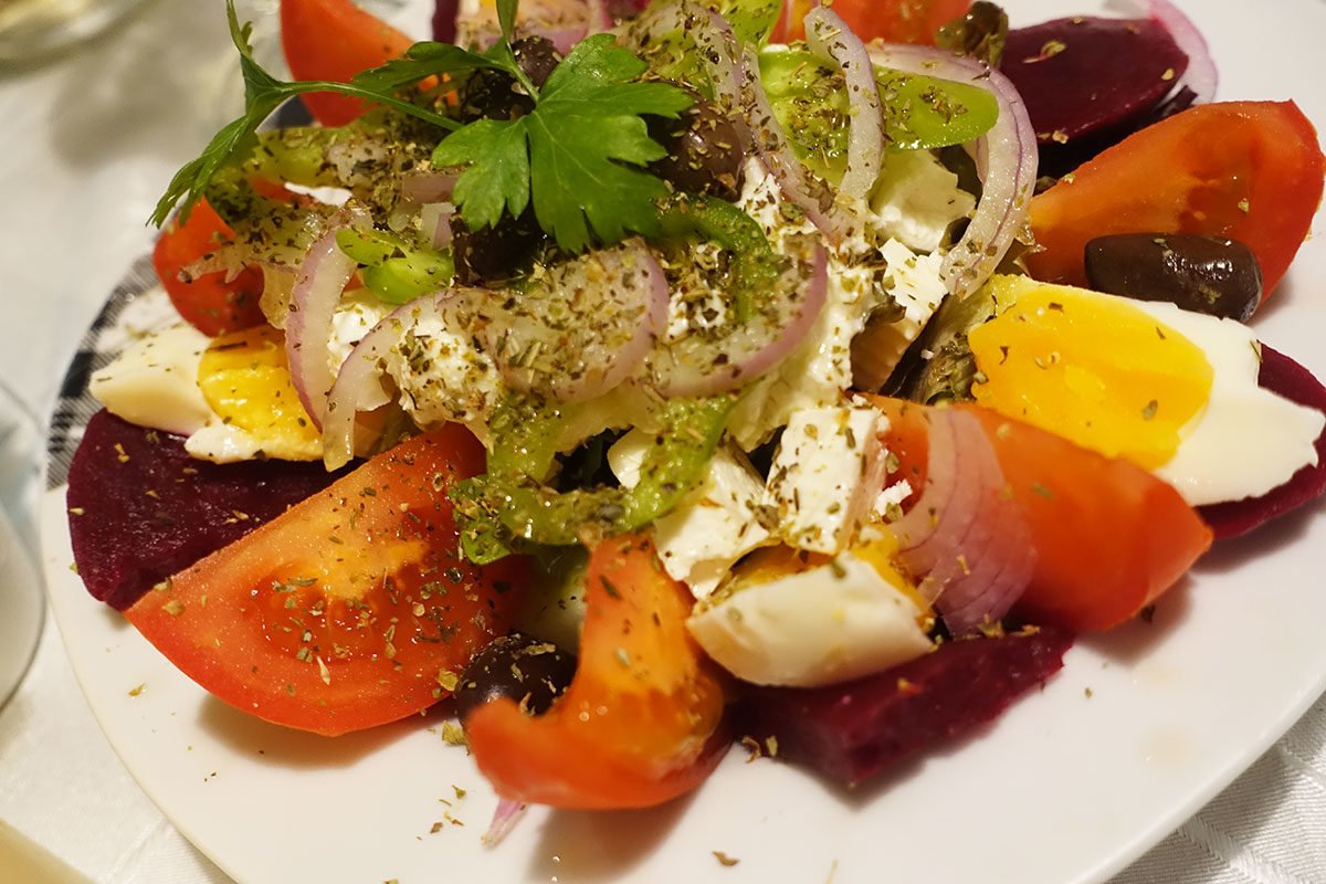 Daarna een salade van het huis met bietjes, tomaat, ei, ui, feta en paprika. Griekse salade, maar dan net even anders.