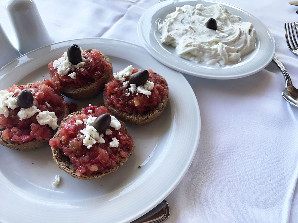Vooraf Dakos, een typisch Kretaans gerechtje van gebakken broodjes met een tomatensalsa, feta en olijven. En natuurlijk tzatziki, daar eten we zoveel van deze week, echt lekker.