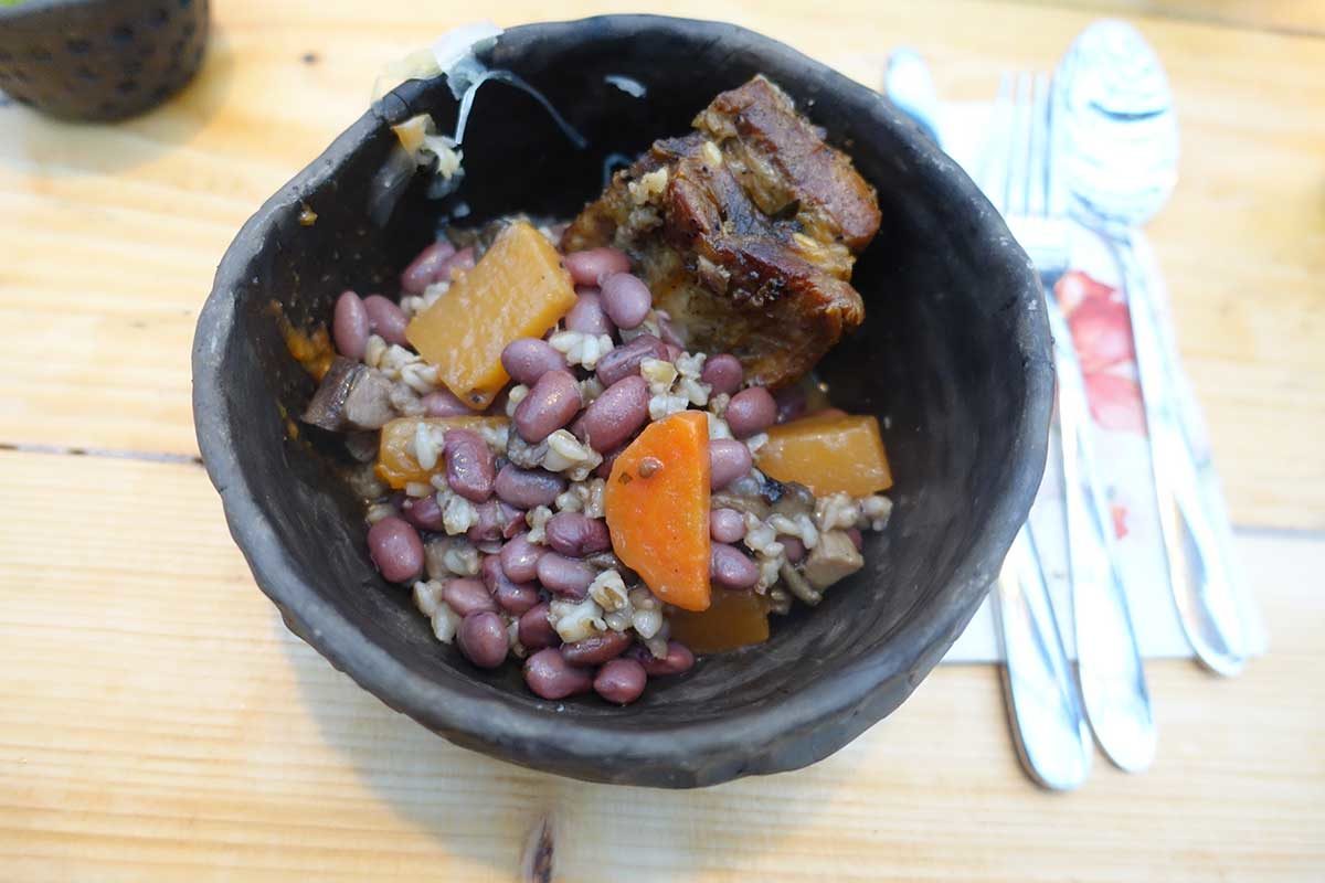 Als hoofdgerecht krijgen we een stuk varkensvlees en een soort stoofpot van bonen en gort.