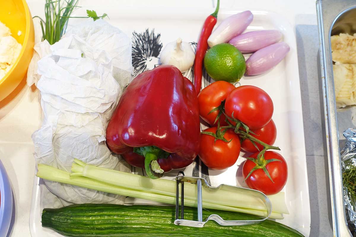 Het voorgerecht: een tomaten-paprika soep met daarin dus de vis en kaas.