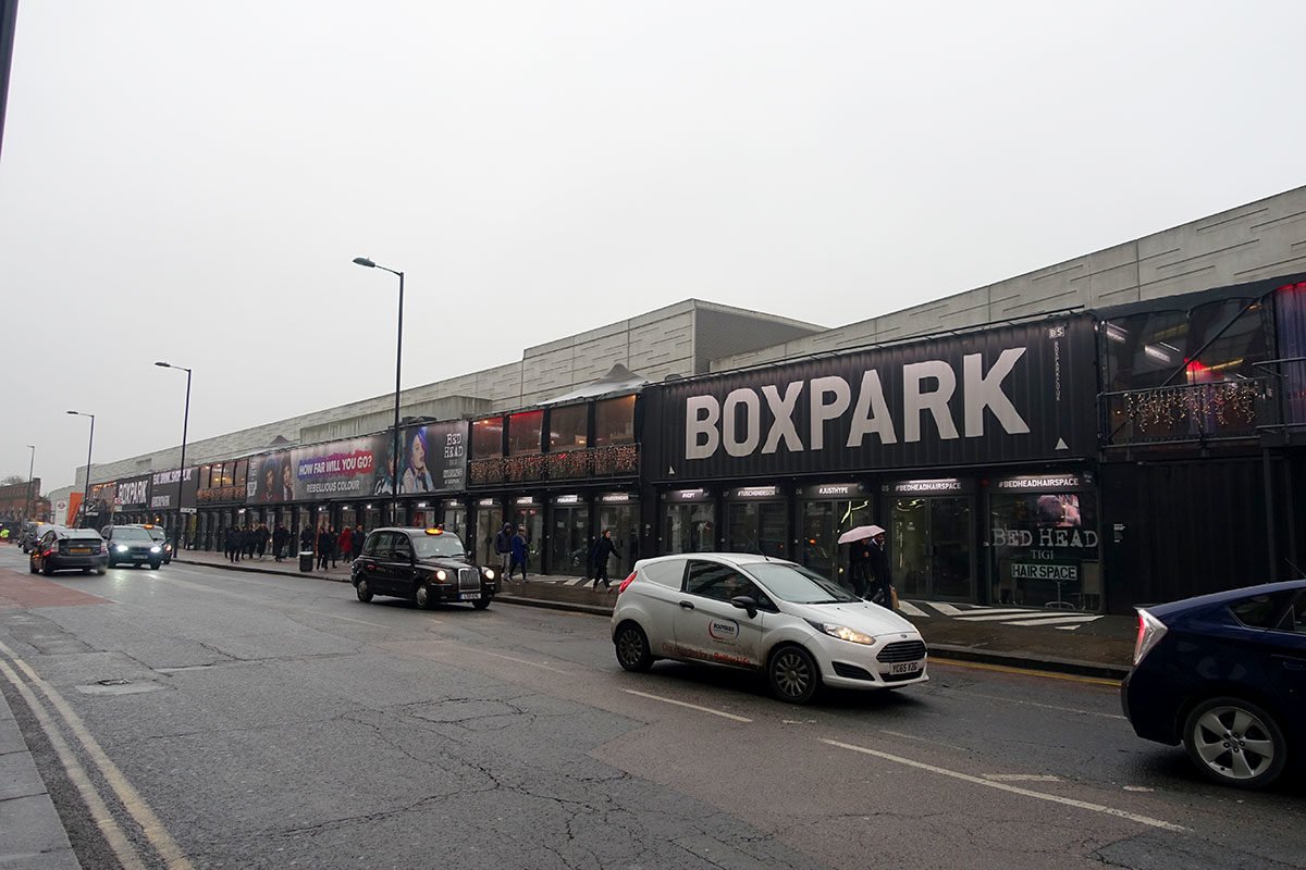 BOXPARK is een soort winkelcentrum opgebouwd uit containers. Ook zitten er wat plekjes om te eten en drinken.