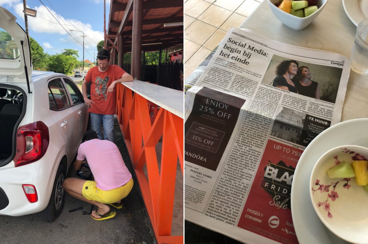 Kim en Marijke staan in de krant met #SMMCUR, wooohoo! Supervet. En minder vet: we hebben onderweg een lekke band. Haha, we hebben op vakantie altijd wel iets met huurauto’s, weet je nog dat onze huurauto werd gestolen op Sint Maarten? Gelukkig hebben we een ‘thuiskomertje’ in de auto en repareren ze voor 7 gulden (!) onze band bij een tire tire.