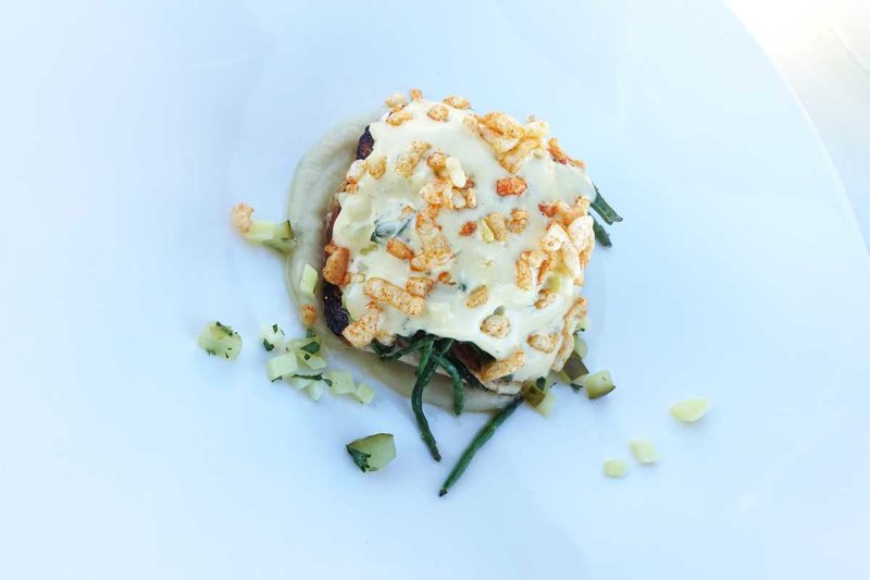 De tweede gang: Noordzee scholfilet met creme van artistjok, citroen, aardappel, augurk, zeekraal, een luchtige remoulade en kleine stukjes krokante aardappel. De remoulade is héél luchtig, puur smaak, en is gewoon super in combinatie met de vis. Artisjok bij vis is dus ook echt te gek, had ik niet verwacht!