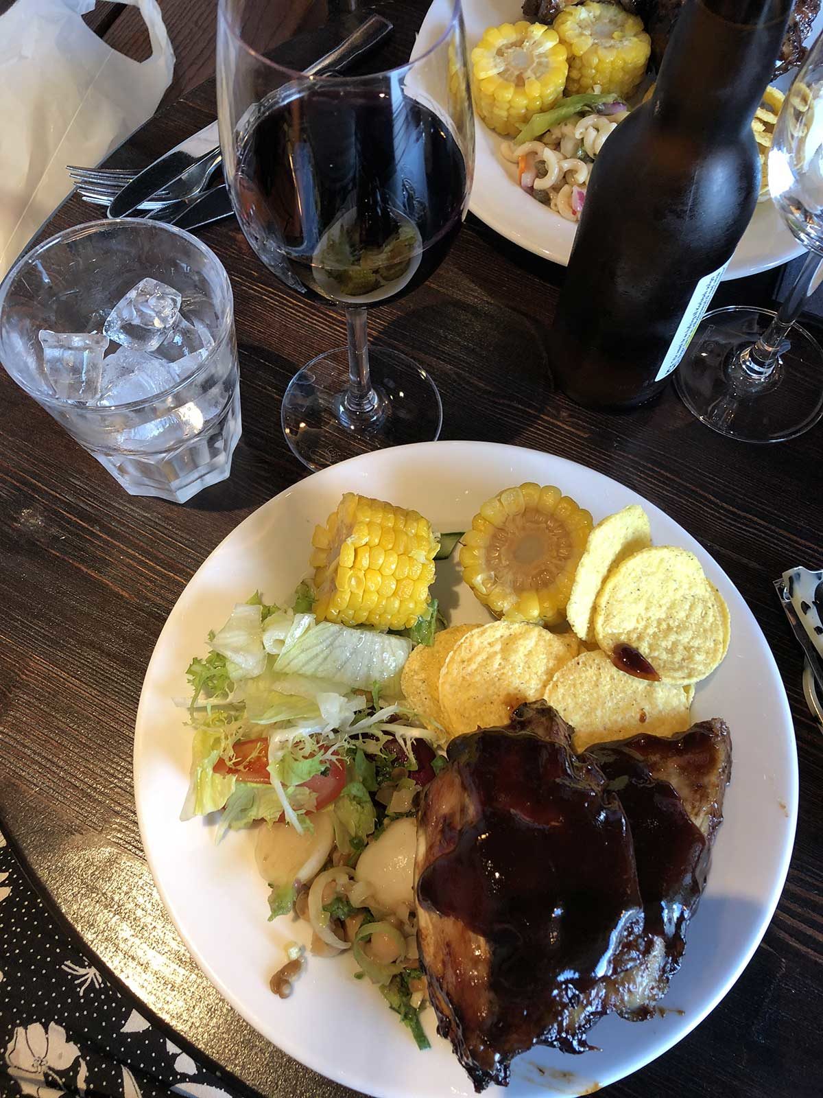 We eten in het hotel: er is een klein buffet met spareribs en allemaal andere lekkere dingen.
