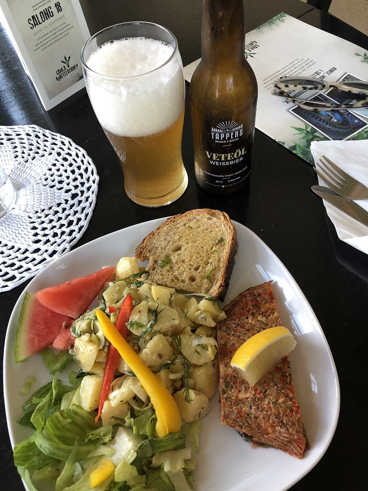 We krijgen hier ook een erg lekkere lunch met gerookte zalm en aardappelsalade. En een lokaal biertje! Er word hier aardig wat bier in de omgeving gebrouwen.