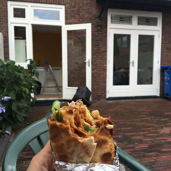 Onze eerste maaltijd hier: lahmacun. Even pauze tussen de bedrijven door! We zijn de hele dag heel druk maar krijgen ook veel gedaan.