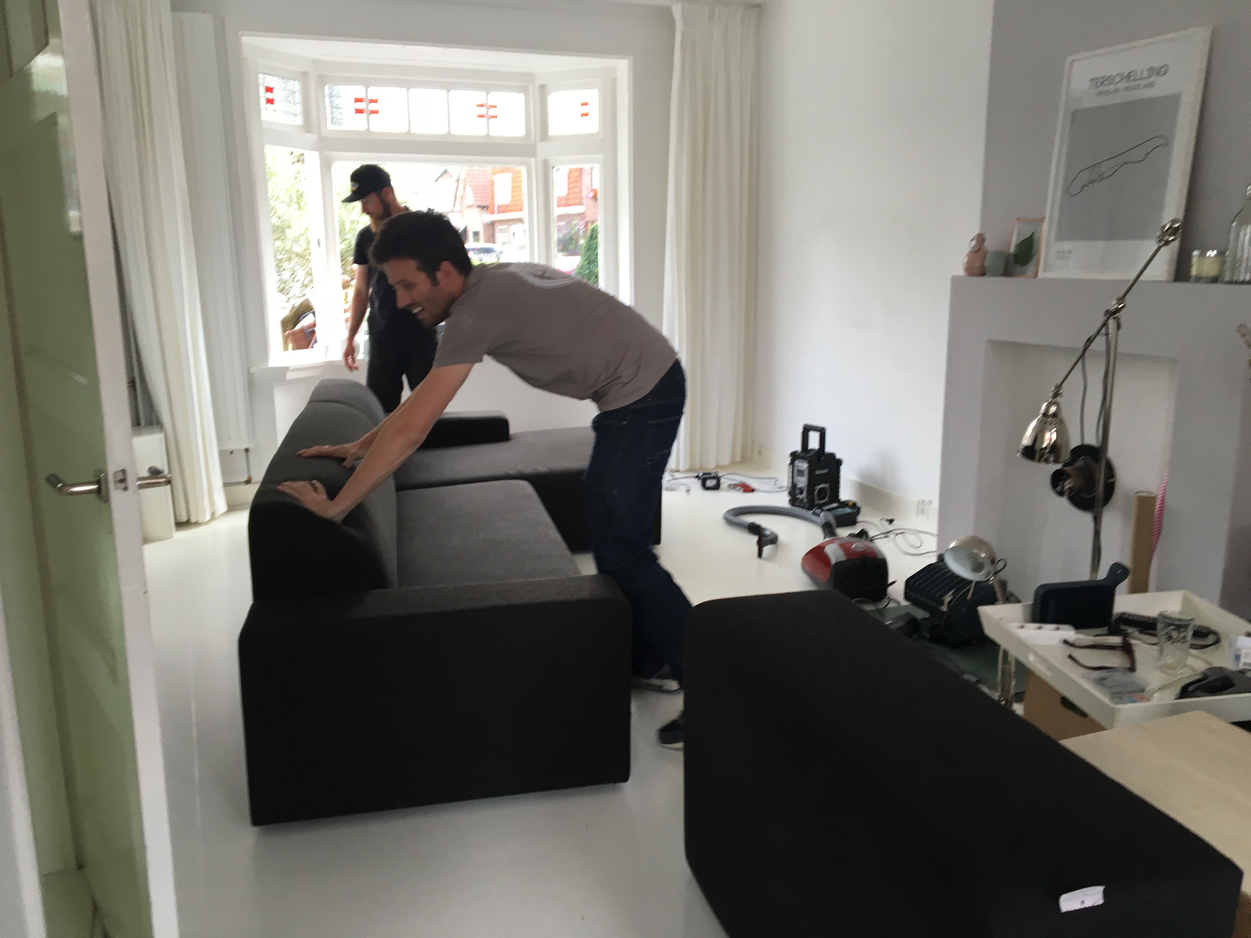 Dit is een spannend moment: we eten niet helemaal zeker of onze bank ‘past’ in de ruimte. We weten dat het qua afmetingen kan, maar niet of het wel klopt qua verhoudingen. Het is een enorm gevaarte dat perfect paste in het appartement, maar niet ‘gemaakt’ is voor deze woonkamer. Nu het er eenmaal staat moet ik er aan wennen, maar het k谩n wel. En als ik het over een paar maanden toch niet zo mooi vind, dan zetten we hem te koop. Maar voor nu denk ik dat het goed is.