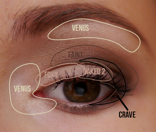 De kleuren: Venus, Foxy, Walk of Shame, Naked 2, Faint, Crave. Alle kleuren zijn mat, behalve Venus. Venus is een glanzende highlighter. Foxy en Walk of Shame zijn ook highlighter. Foxy is mat met een gele ondertoon, Walk of Shame is mat met een rode ondertoon. Naked is een heel lichtbruine tint en Faint is wat donkerder, ideaal voor in de arcadeboog. Crave is pikzwart.
